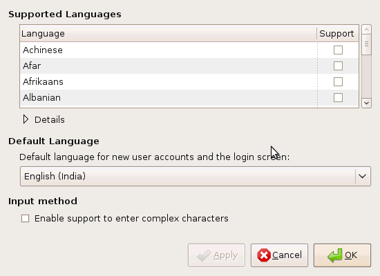 Bây giờ, bạn có thể chọn ngôn ngữ mà bạn muốn trong danh sách ngôn ngữ mà hệ thống hỗ trợ (Supported Language List). Nhấn Apply để cài đặ ngôn ngữ mới. Chọn ngôn ngữ ngầm định trong phần Default Language. Click OK để kết thúc thao tác.